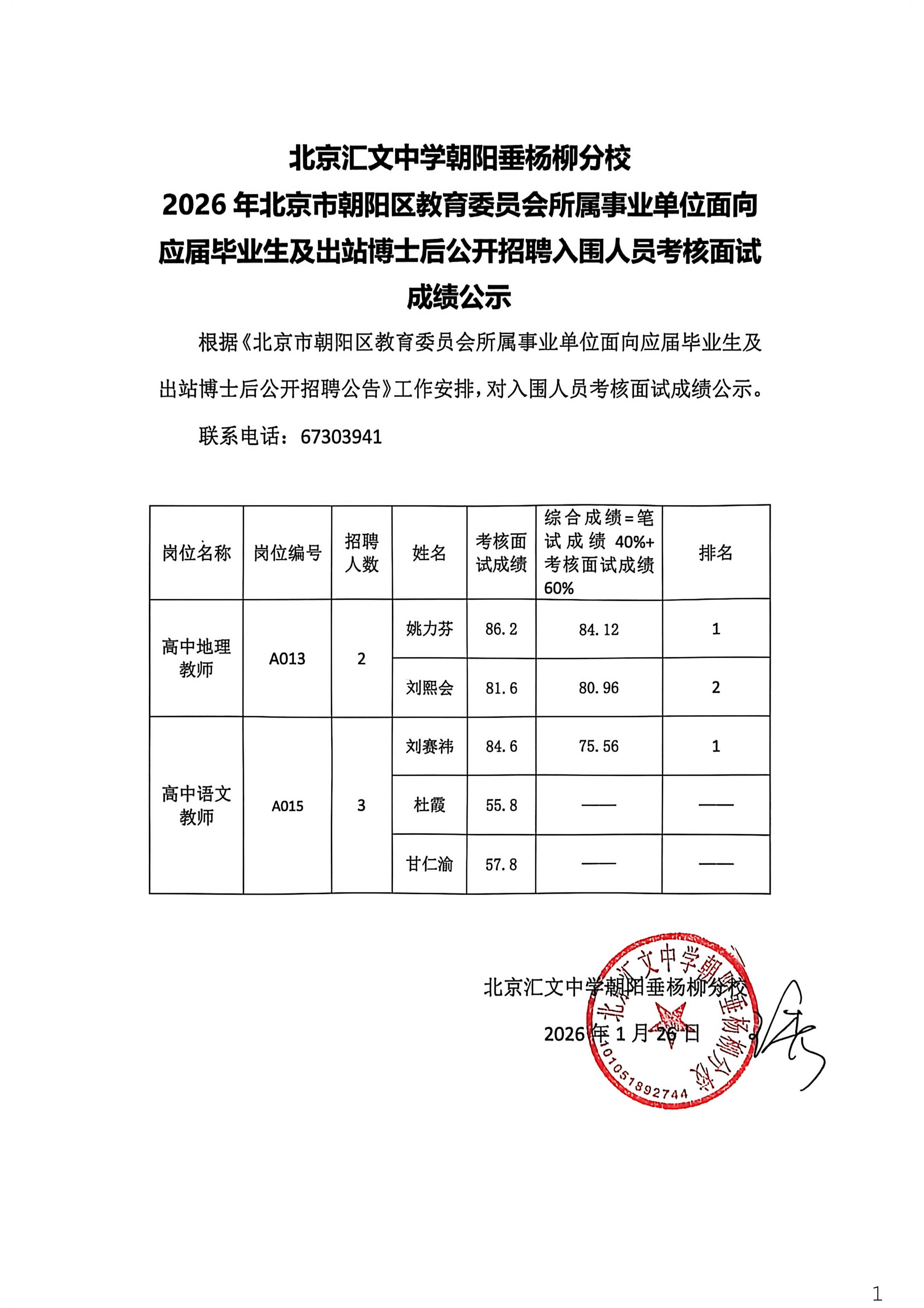 北京汇文中学朝阳垂杨柳分校面向2024年公开招聘毕业生入围...
